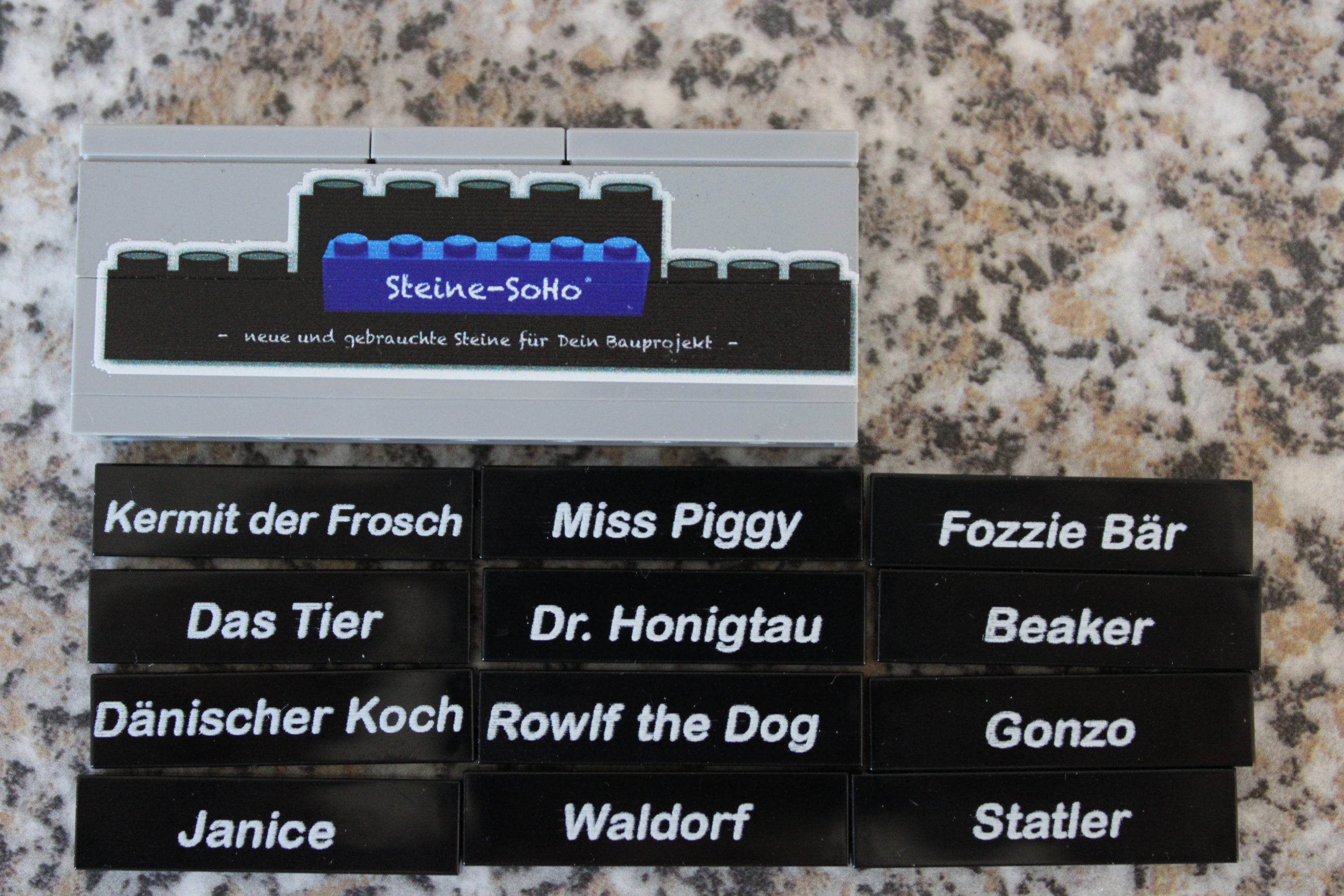 Sie erwerben hier 12 neue schwarze Fliesen (1×4) mit jeweils dem Namen aus der Figuren-Serie.